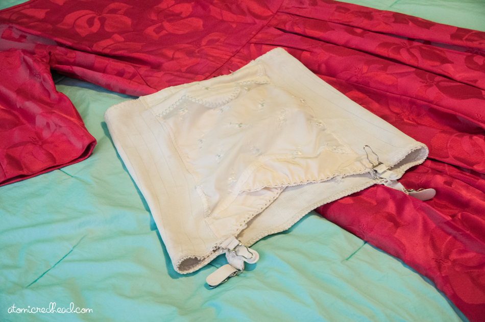 I’ve noticed among other vintage girls that wearing girdles is something that one gradually works up to. First is vintage dresses with no hosiery. The further a lady gets into vintage, the more likely she’ll start wearing pantyhose or modern thigh highs. Then she starts experimenting with modern stockings and department store or Victoria’s Secret garter belts, which, because they are crappy, are quickly abandoned. Next are fake seamed stockings and good everyday vintage or repro garter belts, then fully fashioned stockings and light stretch girdles. By the time she reaches paneled, hook-and-eye, zippered open bottom girdles, the die is cast and she’s a full-blown vintage everyday girl. I went through the same process myself and now wouldn’t even think to go out of my house without wearing my girdles and stockings.