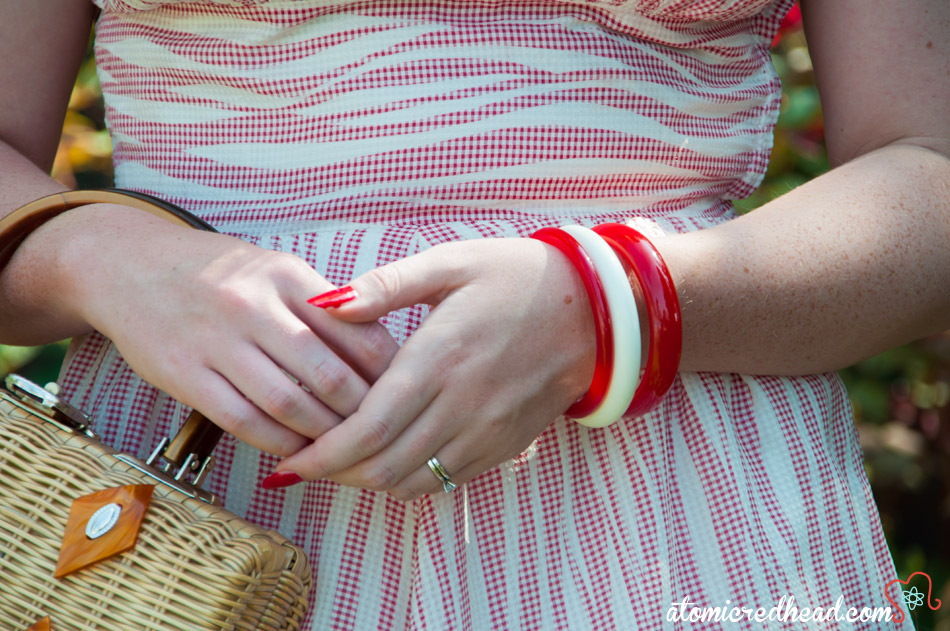 Many guests had adorable accessories to their gingham dresses. Cassandra of Dear John Vintage wore an adorable wood and Lucite kitty brooch, and Jennifer of Jumblelaya wore a darling necklace of apples.