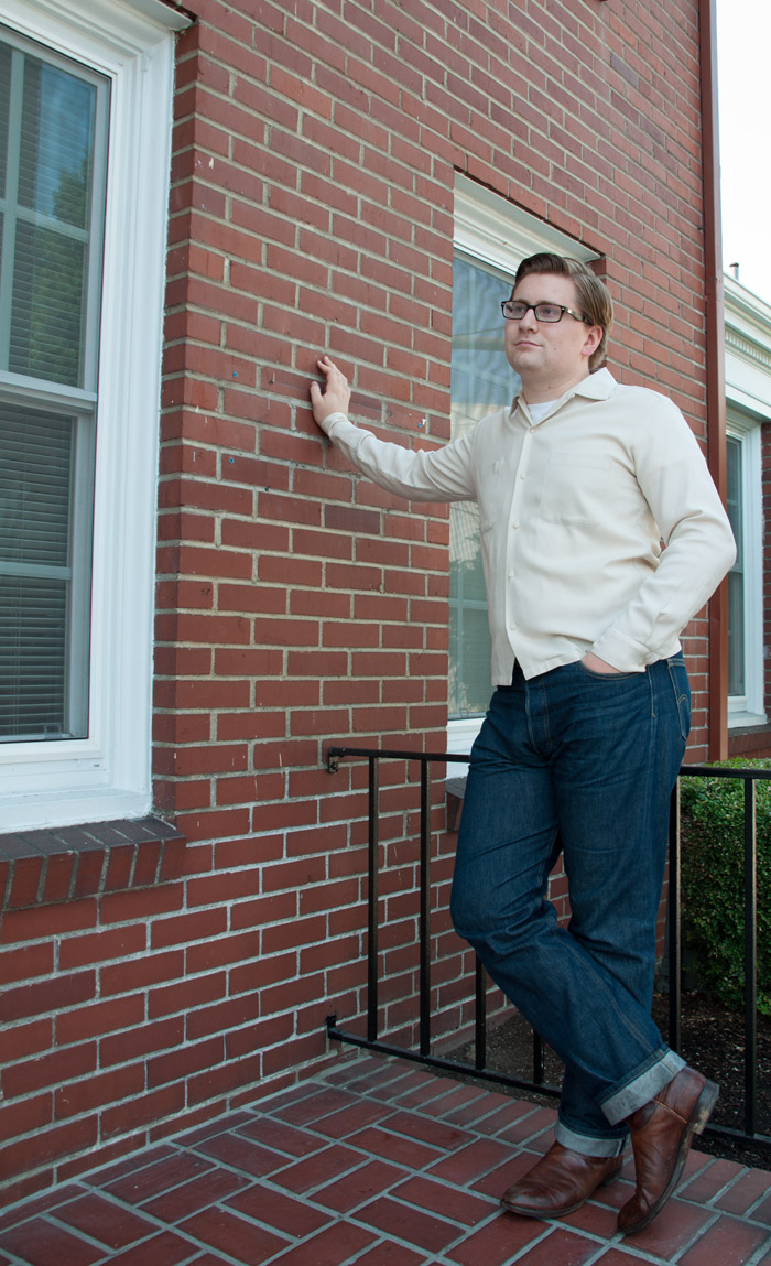 Shirts made of linen and gabardine occupy a space between everyday wear and dress shirts.  They are very, very nice, but tend to be a little more expense around $40-$60.  Gabardine is a very tight knit of wool generally found in 4os clothing. It’s incredibly high quality and very fashionable.  Linen is great at keeping you cool and breathes well, it also feels strong and smooth. The downside is, as Janey puts it, “If you look at linen wrong will wrinkle.”  So buying a linen shirt is not to be taken lightly. This one was just too great to pass up.  Portland’s own Living Threads Vintage has a great selection of menswear, which is where I picked up this linen shirt.