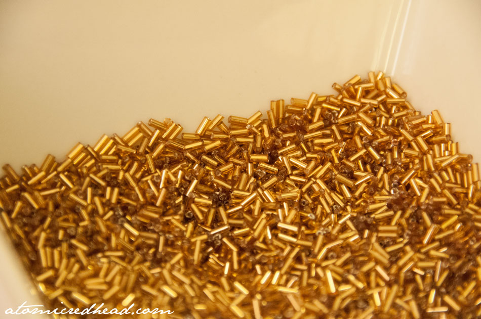 Dixie’s debut costume is a beautiful red and gold concoction that features triangles of gold glass bugle beads along the bust, edge of skirt as well as arm drapes. I checked out the aisles of trim at the country’s largest fabric store (thankfully located right here in Portland, Oregon!), Fabric Depot, in search of what I needed, only to come up empty. There wasn’t anything remotely close to what I needed. So, here I am, hand beading my own triangles…