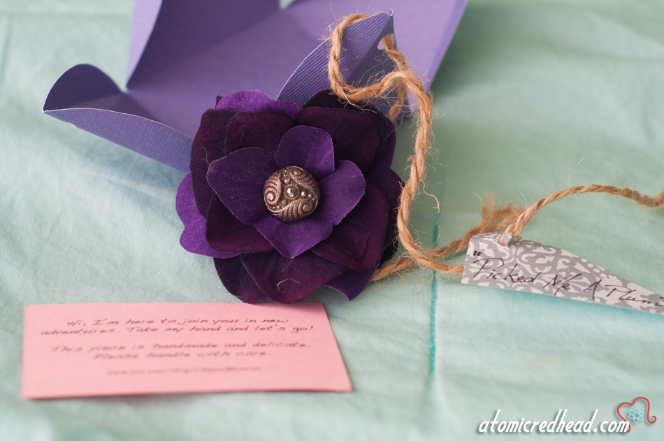 I was recently approached by the gracious Jamie of ChatterBlossom who was not only interested in sponsoring my blog, but also in giving me one of lovely hair flowers to review! When it arrived, it was wrapped up so pretty, I couldn’t imagine a more darling form of packaging!