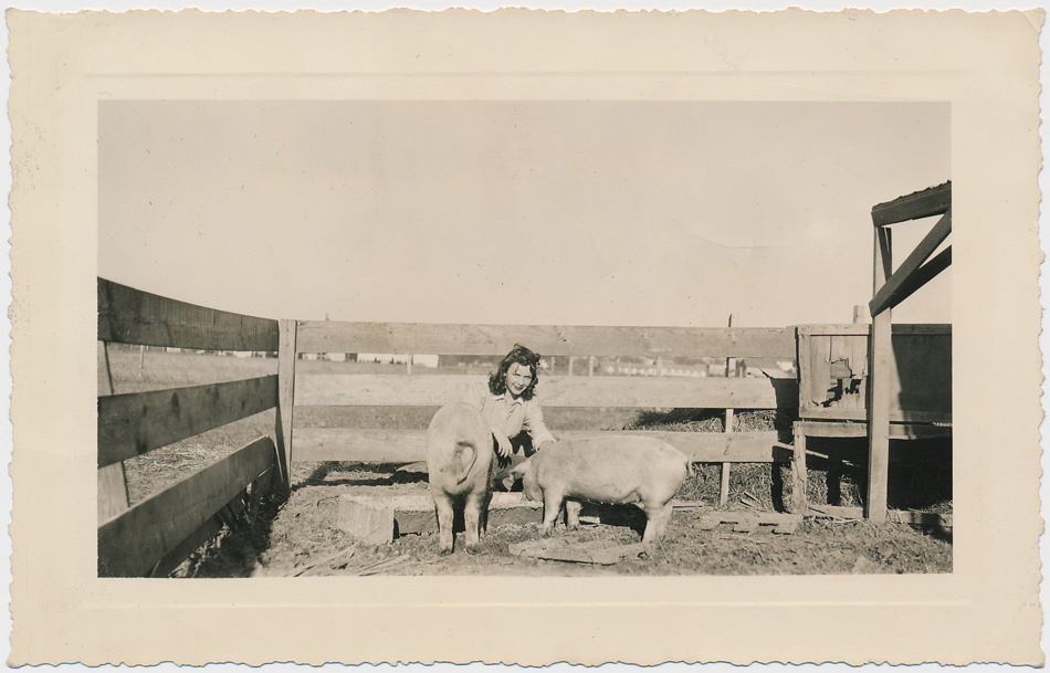 This one of a girl and two pigs I thought was really interesting. It’s the same girl as the one of that includes two calves just above, so I assume she lived on a ranch. I was really drawn to her swell casual look, but I just adore the hand-written caption on the back of the pig photo…