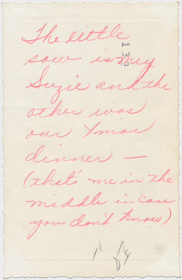 If you can’t make it out, it reads “The little sow is my Suzie and the other one as our Xmas dinner – (that’s me in the middle in case you didn’t know)” What a sense of humor!