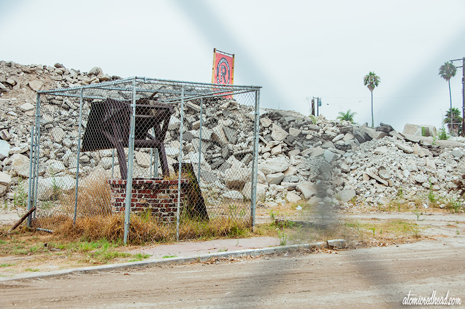 Built in 1947 by Martin “Bud” Smith, the Wagon Wheel Motel and Restaurant quickly became an icon of the city of Oxnard, with its stunning neon, and western themed building. Later Smith added more buildings, including a roller rink and a bowling alley, both of which still stood during our visit, though the Wagon Wheel itself had been reduced to a mound of concrete hunks and twisted iron rods.