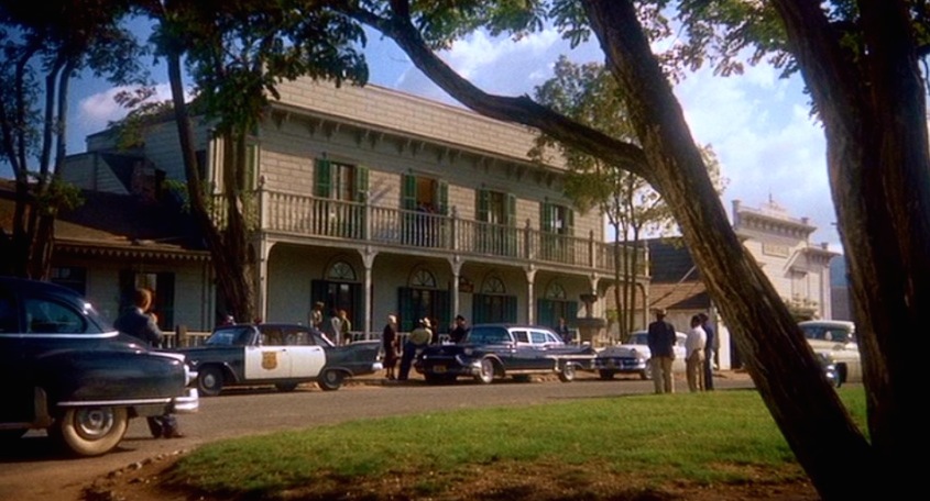 Mission San Juan Bautista hasn’t changed a great deal since Hitchcock filmed here back in 1958, but fans of the film who have never been to the location may notice one very important piece missing, the large, square bell tower stretching over the rooftops. At one time the mission did feature a tall steeple, however it was demolished after a fire. Hitchcock created his bell tower (one that looks nothing like the original steeple) using a combination of matte paintings, models and trick photography.