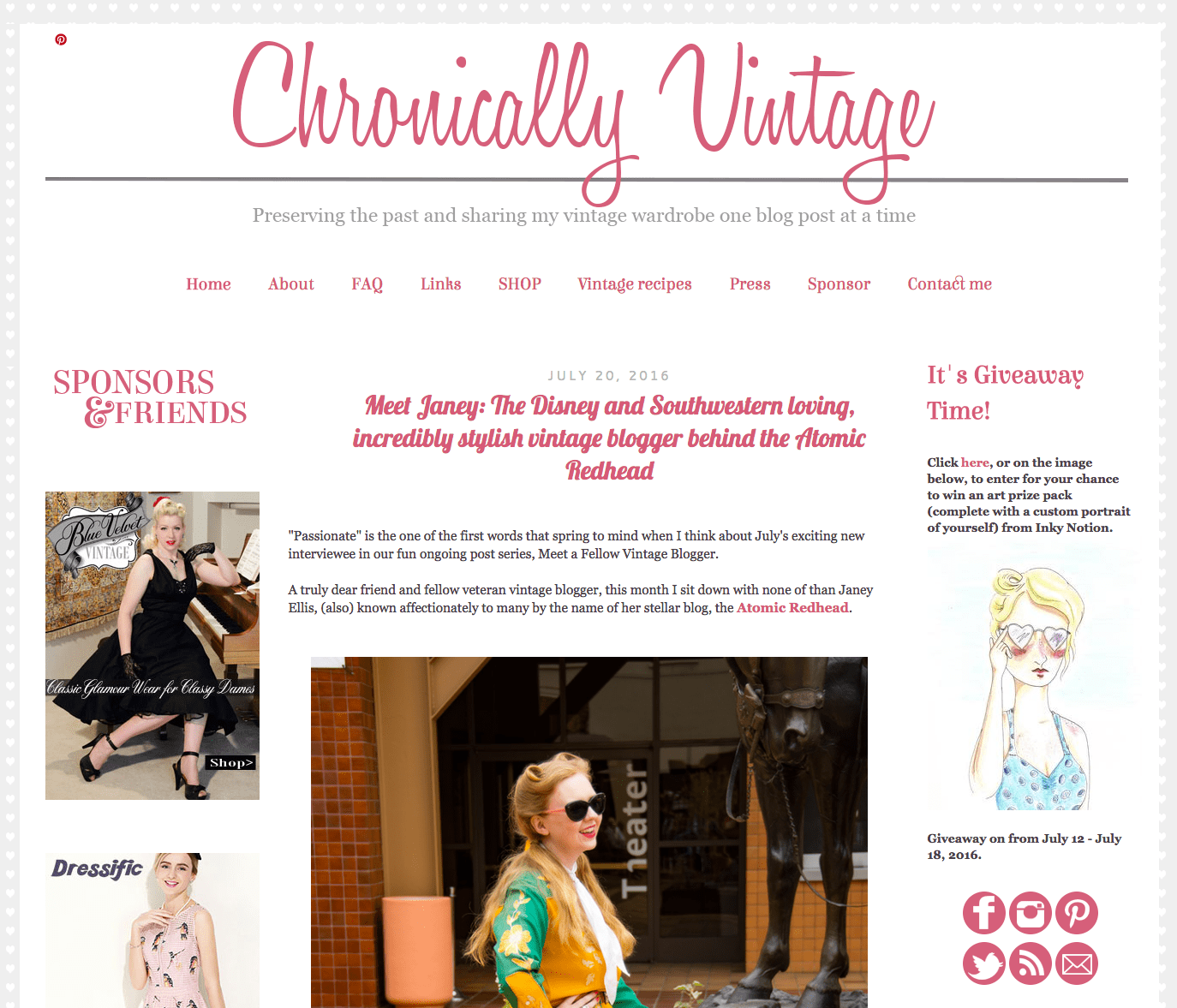 Some time ago fellow blogger and dear friend, Jessica of Chronically Vintage started an amazing series where she interviewed fellow bloggers, so we the readers could learn more about bloggers we already follow, as well as discover new blogs for ourselves. She asked those interested to express so, and I willingly offered up myself as a participant! And today my interview with Jessica was published! So hop over to her amazing blog and learn a bit more about me!
