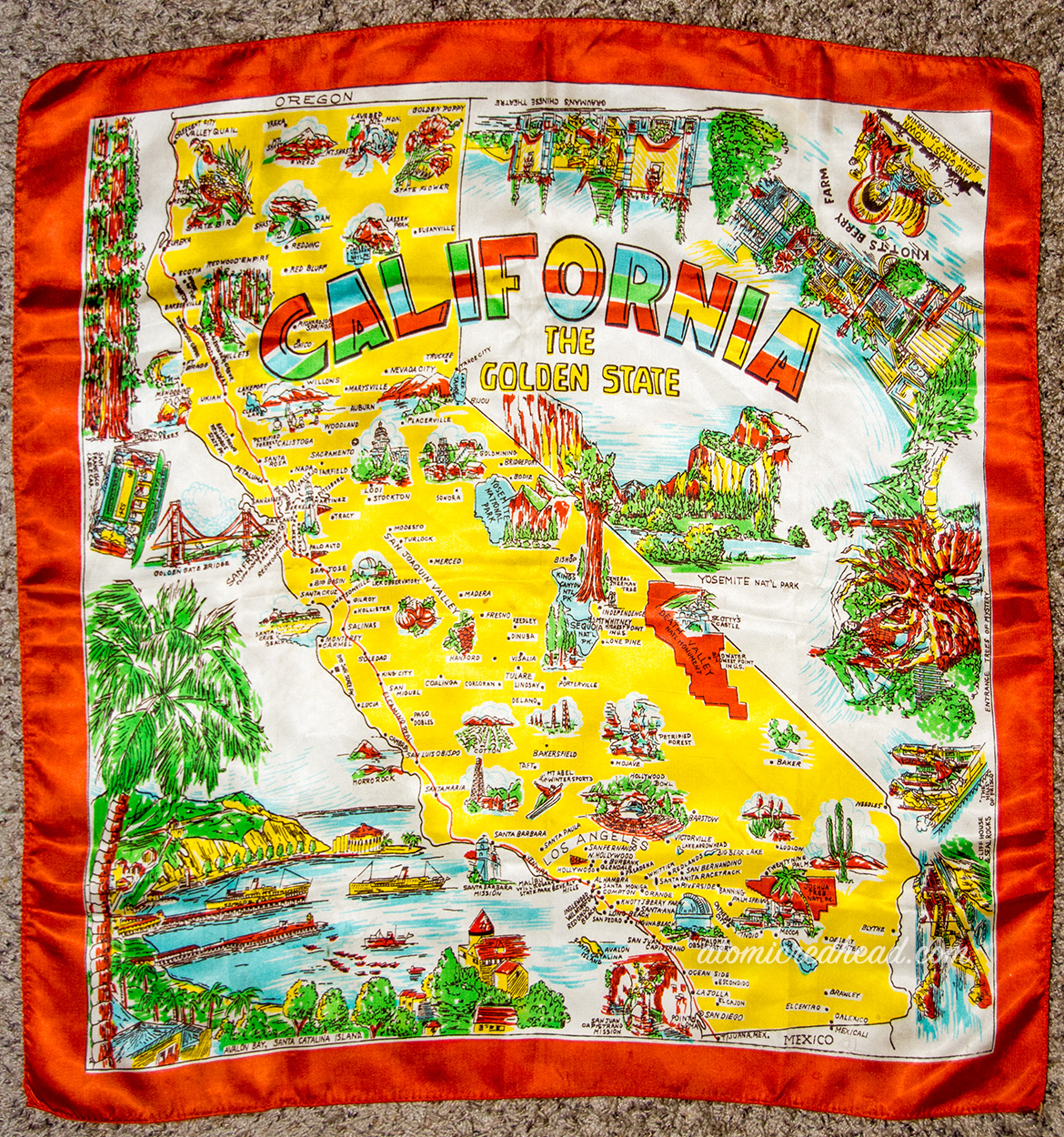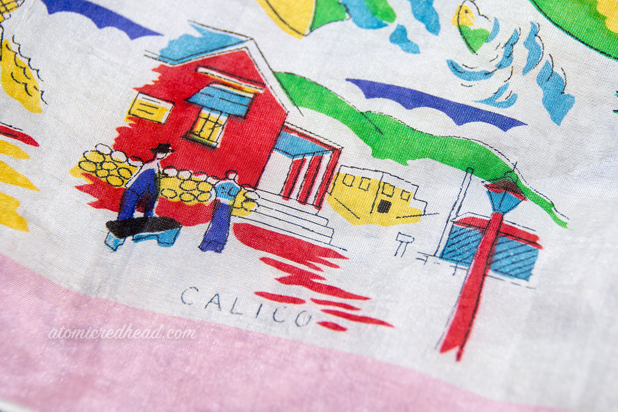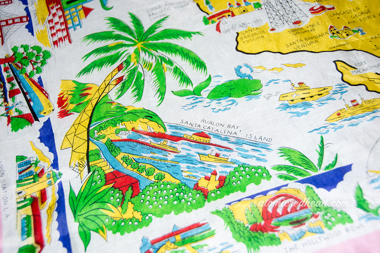 Love them! I have the 2nd tablecloth too plus a couple of CA handkerchiefs not in your collection. So, more to find, right? The only way I’ve found to even partly showcase them is on your head 50s style. By the way, I live up by that exploding volcano found near the top of most of these!