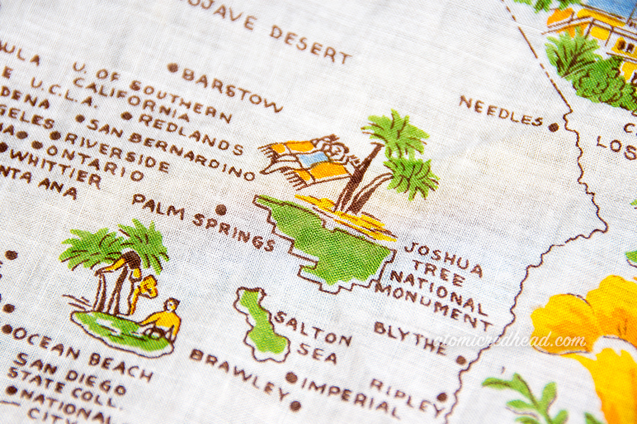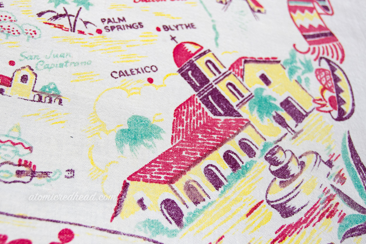 Long before moving to California I had started to collect vintage California souvenir linens, if I had it my way I would honestly love to collect these style of linens from all over! I love the fun illustrations that are scattered throughout that attempt to capture the various attractions of the state.