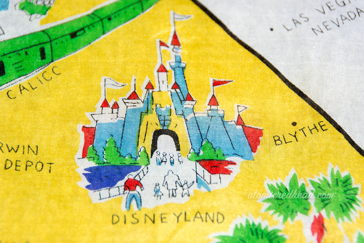 This next scarf I love because an entire corner is dedicated Knott’s Berry Farm. You’ll note that this scarf doesn’t have Disneyland on it, but does of the Trees of Mystery, so I believe this scarf dates between 1946 and 1954. However it does have an error, it reads “Joshua Tree Nat’l Pk” short of “National Park”, although the area was a National Monument until 1994, when it received National Park status.