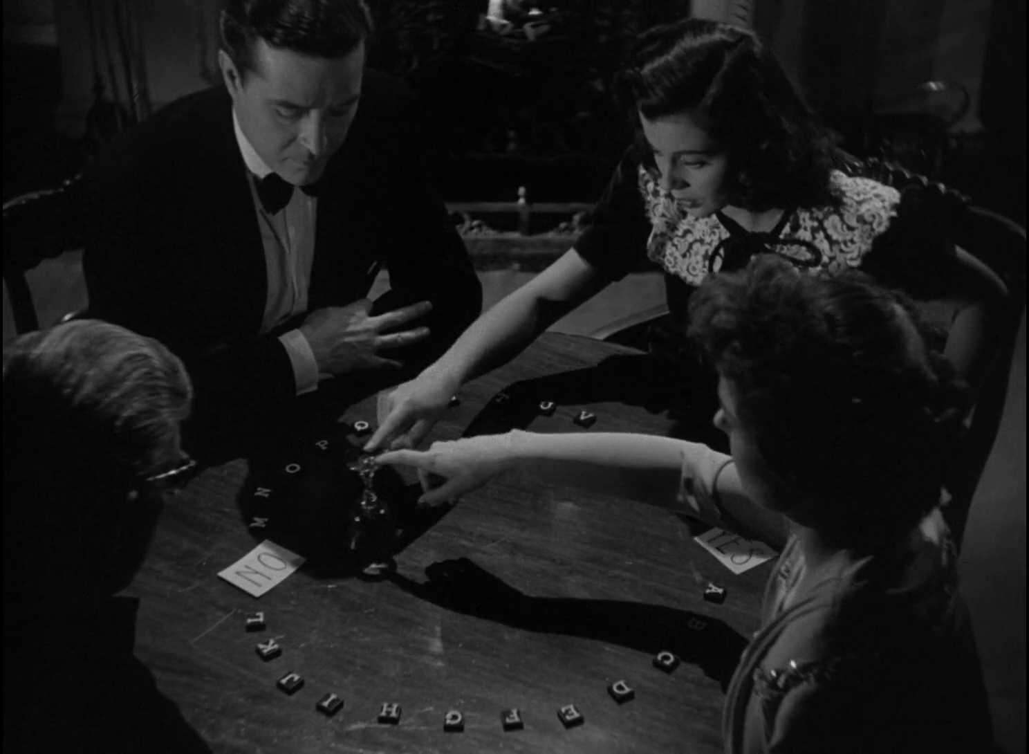 In the 1944 supernatural thriller The Uninvited (which happens to be a favorite of mine) three characters discuss having a séance as a way to help a daughter communicate with her deceased mother. One scoffs at the idea, then another states that “Many intelligent people believe in Spiritualism.” A homemade spirit board is used, the kind which uses anagram letters and an upside down wine glass as a planchette. Near the end of the séance the daughter falls into a trance, but awakes without harm, however later the maid claims that the spirit board is “A heathen device to call devils out of hell.”
