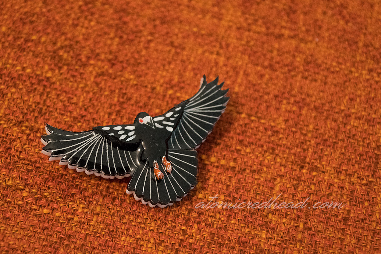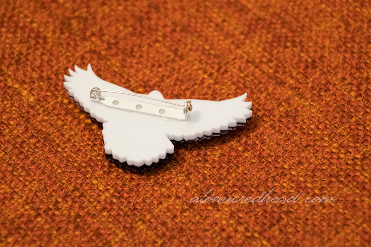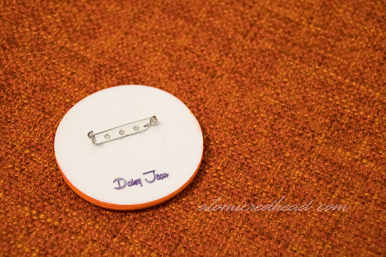 Each brooch is a mini work of art, as they are made of laser cut acrylic, and then tediously hand painted, followed by a coat of resin, and feature a locking clasp glued to the back. It’s important to note and understand that because of the hand made nature of these brooches (and just about anything hand made) there is always the possibility for some minor imperfections, which my pieces had, but I’m always fine with that, because Daisy Jean is upfront and clear about that on their product pages, and I understand it comes with the territory of hand made items, and I believe in supporting small businesses.