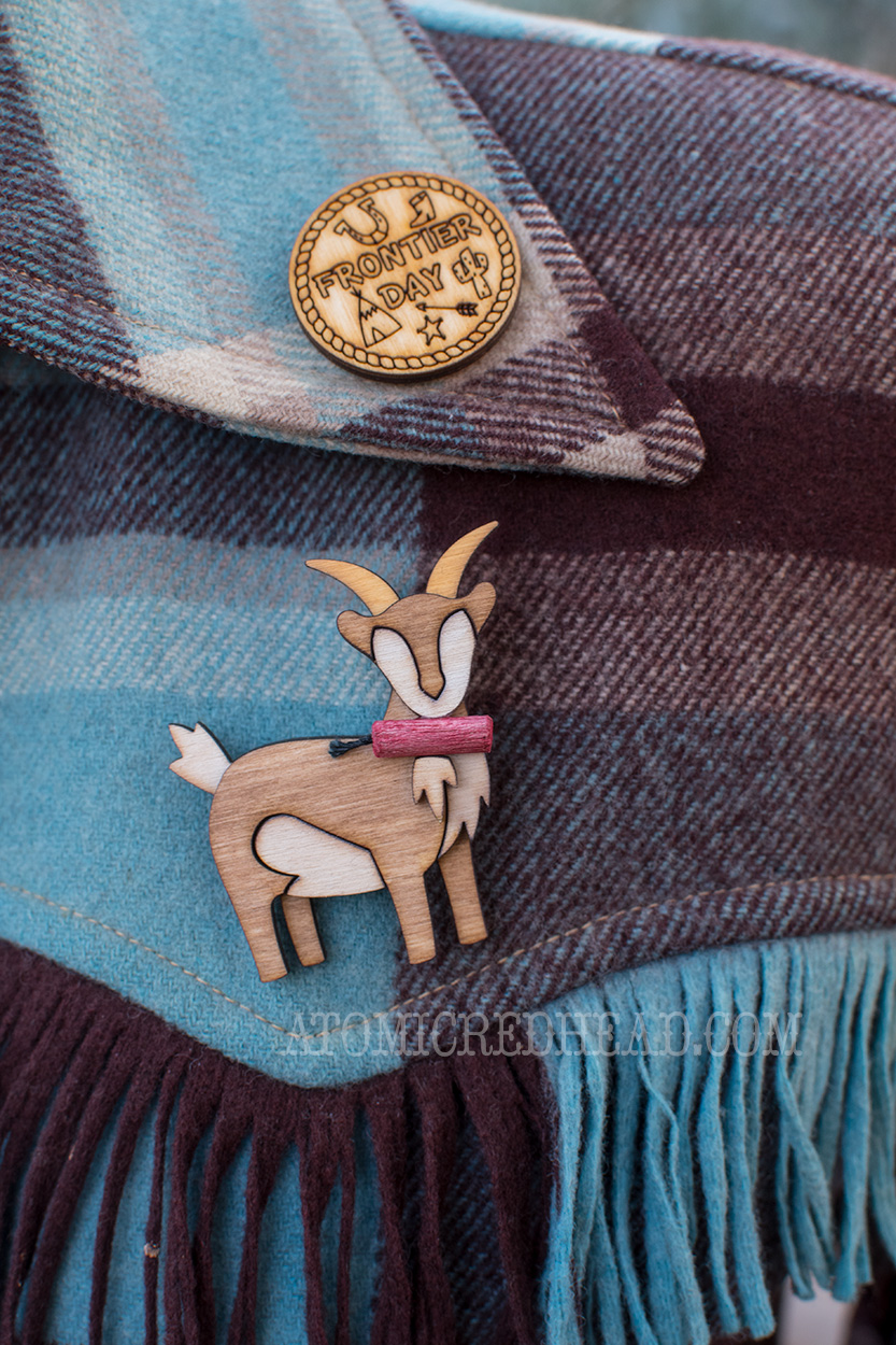 Davy Crockett Guitar Brooch, Big Thunder Inspired Goat Brooch & Frontier Day Pin: Match Accessories