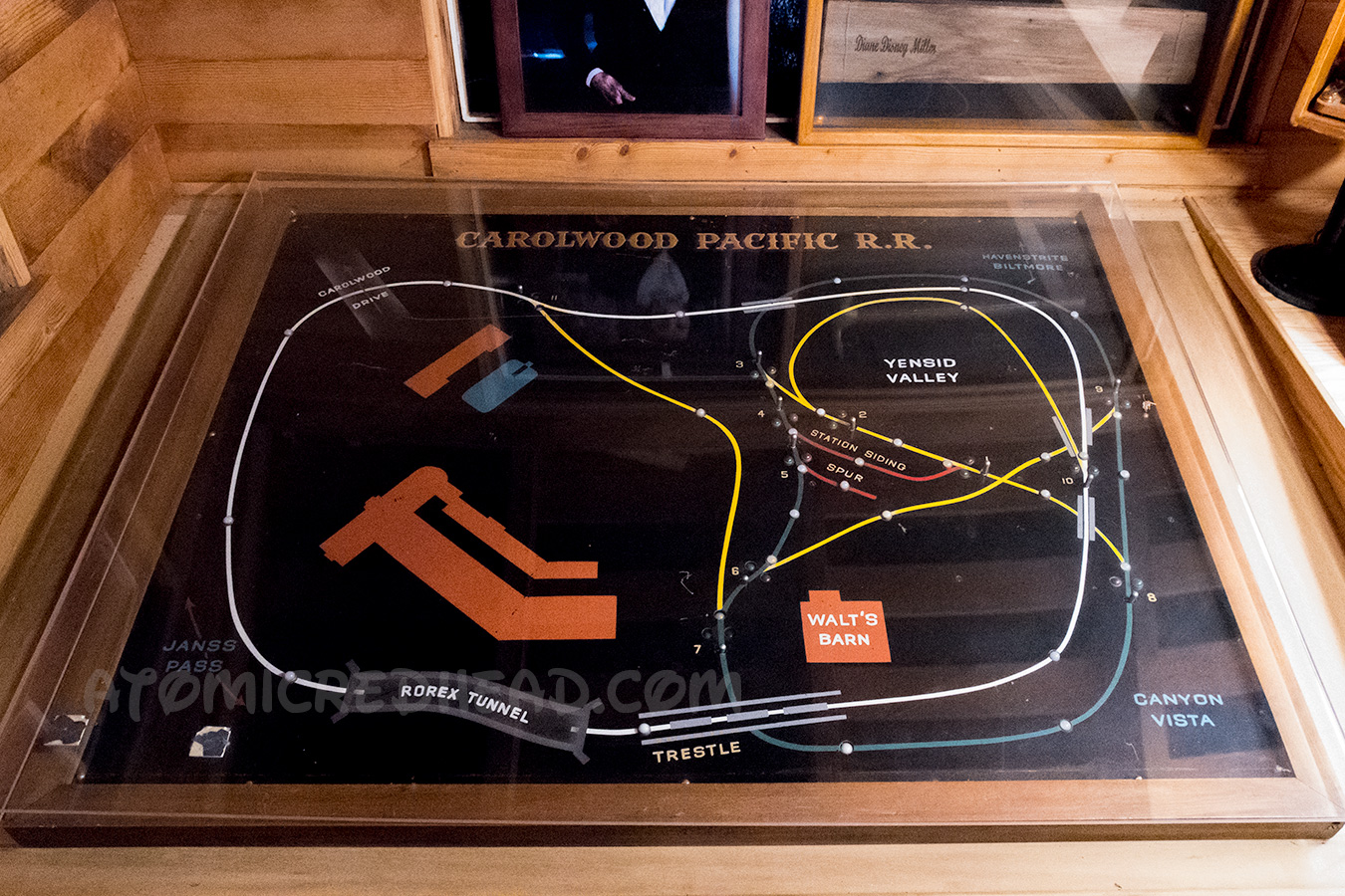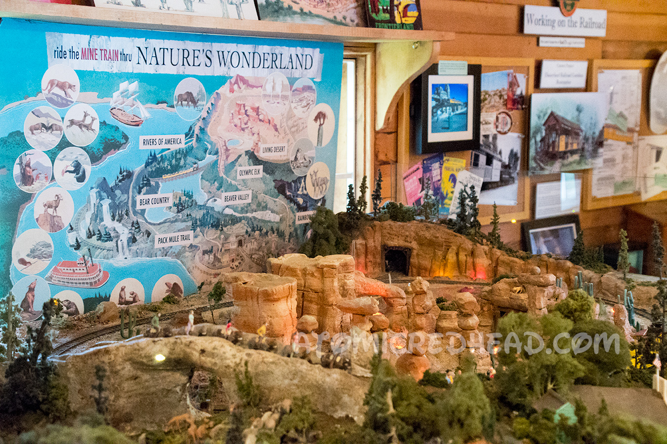 Walt’s miniature railroad was called the Carolwood Pacific Railroad after the street his home was on. The barn he built to serve as his workshop was a replica of the one on his family’s farm during his childhood in Marceline, Missouri. The railroad was Walt’s hobby, a way for him to relax after days at the Studio, and a way of entertaining guests. Walt ceased operating the Carolwood in 1953 when his focus shifted to working on Disneyland. In 1965, Walt donated 1,500 feet of his track and the trestle to the Los Angeles Live Steamers, which Walt helped found. The route using that track became known as the Disney Loop. After Walt’s death, his wife, Lillian, donated the remaining amount of track to the LA Live Steamers, however since then the track has been replaced. In 1999 the Disney family moved the barn to the LA Live Steamers, and it now serves as a museum, showcasing Walt’s passion for trains, including how trains were a large part of Disneyland. There are various artifacts and displays, including a miniature of the Mine Train Thru Nature’s Wonderland attraction (today the same area, and elements of it make up Big Thunder Mountain Railroad).
